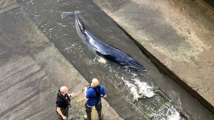 In London haben am Sonntagabend Helfer einen verletzten Minkwal aus einer Themse-Schleuse gerettet. Passanten hatten das Tier in einem Sperrwerk entdeckt.