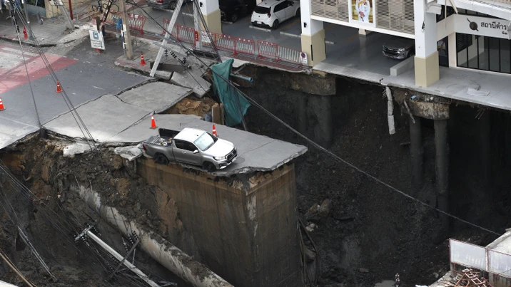 Schockmoment im morgendlichen Berufsverkehr von Bangkok: Auf einmal tut sich vor den Passanten und Autofahrern ein riesiges Senkloch auf. Viele fliehen in Panik.
