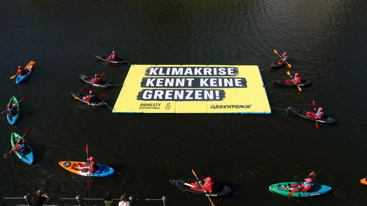 Anlässlich des anstehenden Weltflüchtlingstags haben Aktivisten eine Protestaktion auf der Spree in Berlin veranstaltet. In Kajaks forderten sie unmittelbar vor dem Reichstag konsequenten Klimaschutz und sichere Fluchtwege.