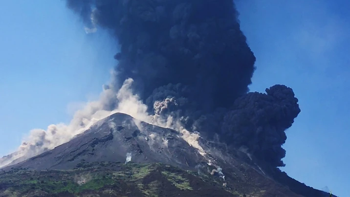Mitten in der Hauptreisezeit bricht in Italien einer der aktivsten Vulkane Europas aus. Einige Menschen springen aus Furcht ins Meer. Eine riesige Rauchwolke steigt auf und verdunkelt den Himmel.